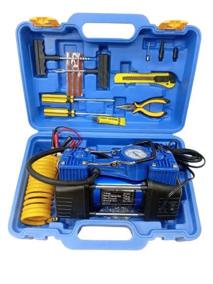 Small air pump used with vehicles. It compresses air and is commonly used to: