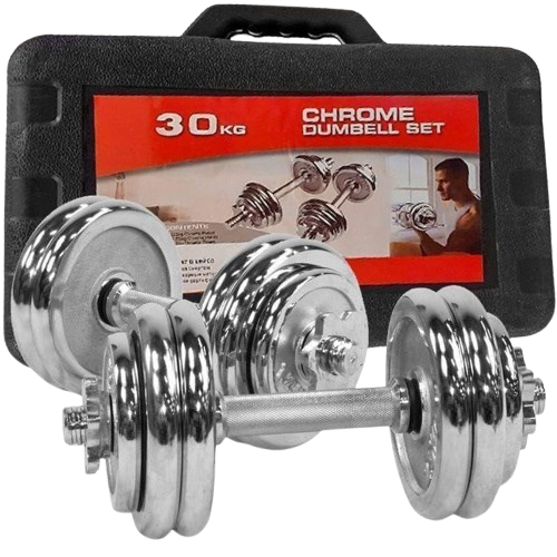 A set of weight plates (chrome or chrome-plated iron) that total around 30 kg including bars