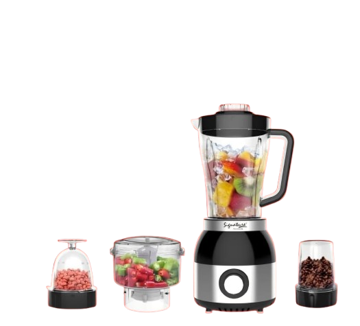 The Signature SG161A 4-in-1 Blender is a versatile multifunction kitchen appliance that combines four essential functions in one unit: blending, grinding, chopping, and juicing. Powered by a 1000 W high-performance motor, this blender is designed to handle a wide range of everyday tasks — from making smoothies and fresh juices to grinding grains, pulses, coffee beans, and spices. Its range of attachments and durable build make it a practical and space-saving tool for home kitchens.